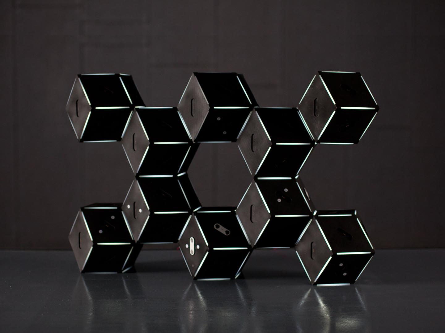 10 rhombic dodecahedrons, assembly system based on magnets, steel, polyamide, methacrylate, Arduinos, Xbee, electronic circuits, led lights, ultra sound sensors, speakers. computer.