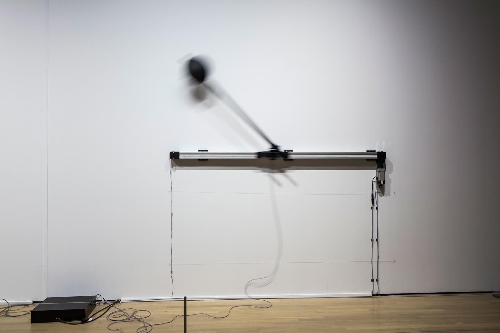 “Clones” uses two identical inverted pendulums: based in a motorized mechanical system, the pendulums are mounted with the pivot point on a cart that moves horizontally. This movement makes the pendulum swing, and once the pendulum rotates to its inverted vertical point, an algorithm takes control of the movement of the cart and tries to find equilibrium against gravity. The artist explores the expressiveness of the system, using human size heavy pendulums, capable of generating enough inertia to generate self-rotation. He also tries to humanize the system in a game of failures and successes.