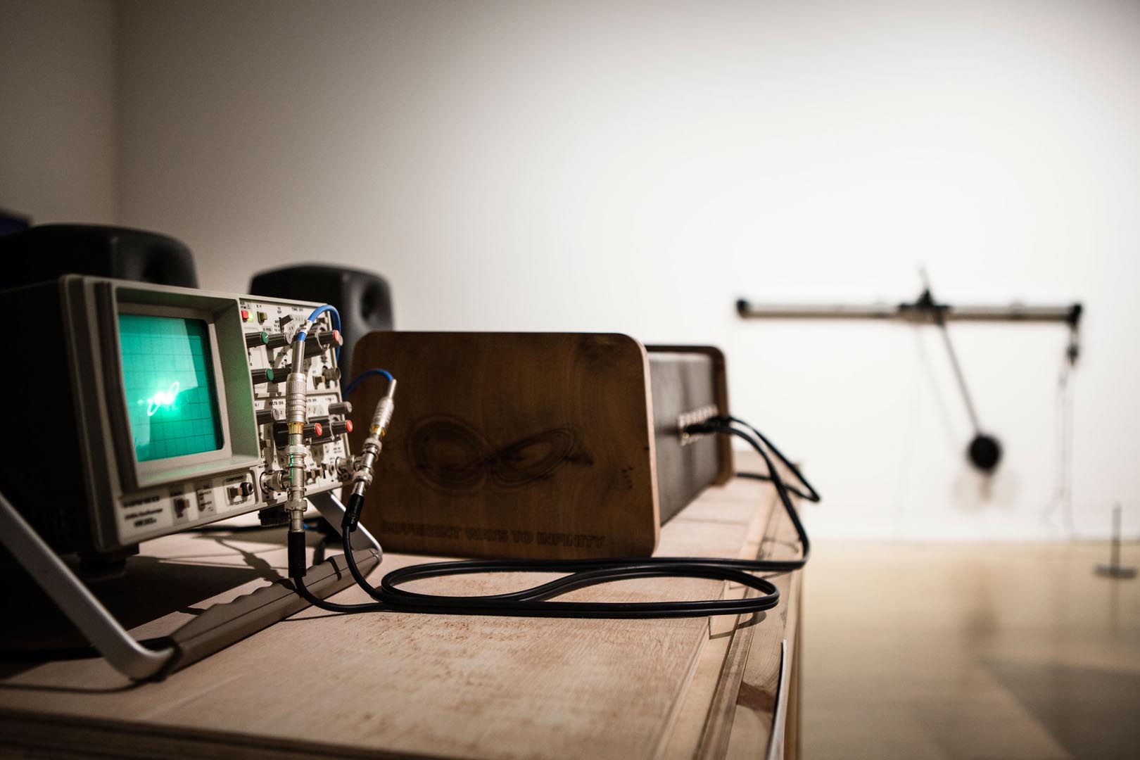 To visualise these processes, the artist uses analogue oscilloscopes. In their display, we can observe in real-time the generation of bifurcation points, a moment where change is so powerful, that it shatters the pre-existing organization, disintegrating in to Chaos. Lorentz attractors are generated at this point, arising order out of chaos (These are fractals, forms that tend to infinity). A small fluctuation generates new evolution that will drastically change the behaviour of the system, achieving a macroscopic state of disorder and maximum symmetry. The system then fluctuates around the attractor state. The resulting forms evoke natural systems, such as weather.